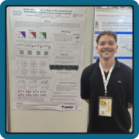 No primeiro ano de seu projeto de doutorado, o estudante conquistou o prêmio de melhor pôster da categoria de Materiais Computacionais com estudo sobre a estabilidade de perovskitas de haleto bidimensionais. A pesquisa é orientada pelo Prof. Gustavo Dalpian.